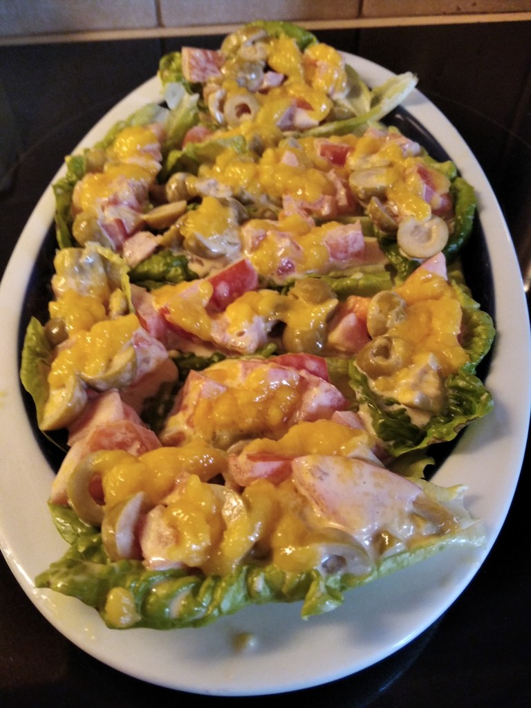 Comenzamos lavandonos y secandonos muy bien las manos, luego preparamos todos los ingredientes encima de la mesa de la cocina y el colador mediano junto con el plato, seguimos luego limpiando la lechuga, hoja por hoja ,en el colador , escurrimos bien el agua de haberlas limpiado y vamos poniendolas ya en la fuente de mesa, colocandolas una al lado de otra,de forma que nos queden bien curiosas así hasta tener toda la fuente cubierta , luego encima de la tabla de cocina, cortamos los tomates a trozos pequeñitos pero antes los habremos limpiado bien con agua del grifo en el colador y los habremos escurrido, los vamos poniendo en el plato, cuando tenemos los tomates cortados, abrimos la lata de aceitunas, les quitamos el líquido que traen y las ponemos encima de la tabla de cocina para ir cortandolas una por una en rodajas, y las vamos añadiendo al plato, luego mezclamos estos ingredientes con las manos (ya que las tenemos bien limpias) y luego apartamos el plato, cogemos el mortero con el mazo y hacemos el alioli, es decir, pelamos y cortamos el ajo, lo ponemos dentro del mortero y lo chafamos y luego añadimos la yema del huevo que tenemos a temperatura ambiente, reservando la clara para utilizar la en otra receta, y con el satrin vamos añadiendo aove poco a poco y removiendo siempre en una misma dirección,asi se nos ira ligando esta delicatessen cuando nos queda como una mitad de aove en el satrin,paramos y añadimos sal ,un pellizco generoso,y luego seguimos removiendo hasta acabar todo el aove del satrin,y ya tendremos listo el alioli luego solo nos queda mezclar los ingredientes o bien en el plato (pero abría que quitar el líquido que suelta el tomate) o bien rellenamos las barquitas de lechuga con la mezcla de tomates y aceitunas que hemos hecho anteriormente y luego ponemos con una cucharita alioli por encima , de las dos maneras queda muy rico y curioso al mismo tiempo, y listo ya este bocado para ser degustado, sino fuera así lo colocamos dentro de la nevera para sacarlo en dicho momento.