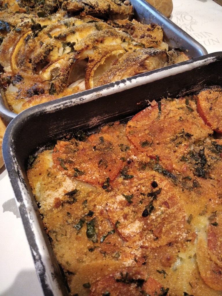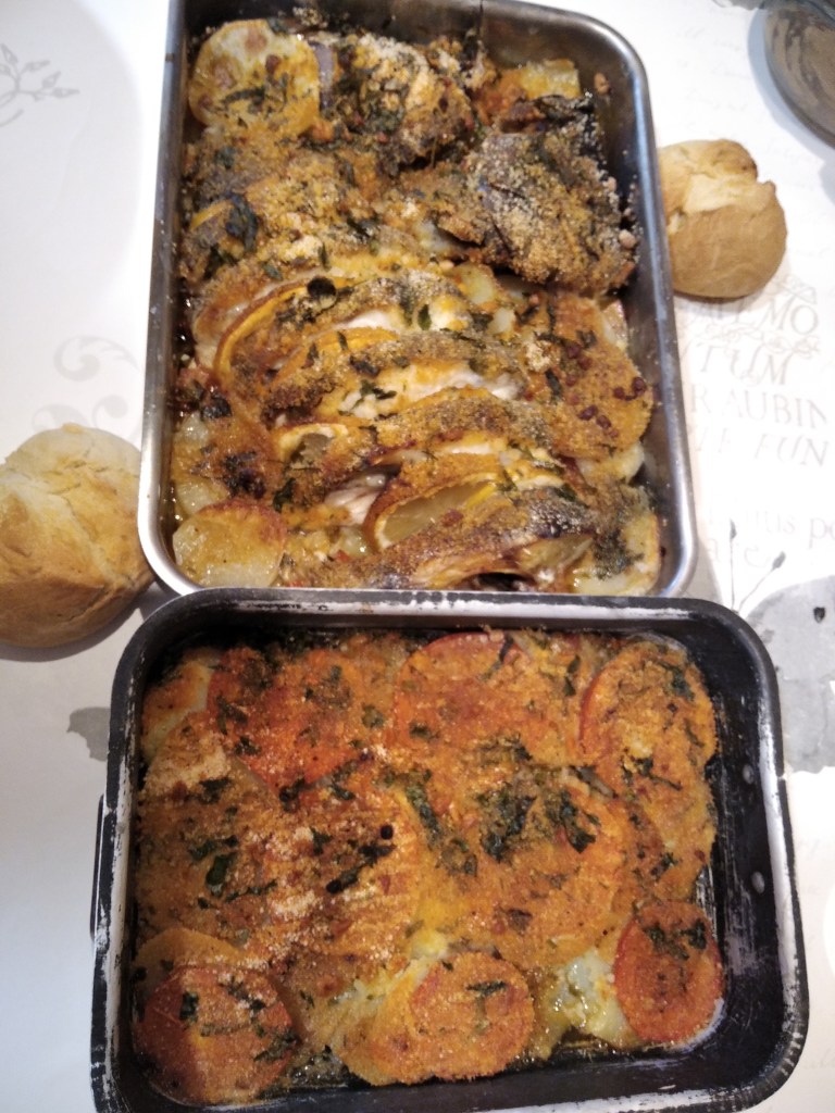 Nos lavamos y secamos bien las manos y preparamos los ingredientes y el colador junto con las dos fuentes de horno, luego empezamos pelando , limpiando en el colador las patatas y las verduras, luego las repartimos, tres patatas cortadas a rodajas, para la fuente mediana y dos patatas también cortadas a rodajas para la fuente pequeña,y las vamos colocando en dichas fuentes,luego los tomates que ya los tenemos limpios ,los cortamos a rodajas y ponemos, dos en cada fuente encima de las patatas, la fuente pequeña la apartamos porque ya la tenemos lista solo nos quedaría poner por encima la mezcla de pan rallado con el perejil picado y aove luego hacemos lo mismo con los ajos , con el puerro y con la cebolla hacemos el mismo procedimiento y vamos salando todas las verduras mientras las colocamos, luego cogemos el pescado que ya lo tenemos preparado, es decir limpio, salado y con las rodajas de Limón entrelazadas y lo colocamos en la fuente mediana encima de todas las verduras después le añadimos la mezcla de pimentón de la Vega con pan rallado y un pellizco generoso de sal, por encima de esta mezcla también le ponemos perejil picado y lo esparcimos por encima de todo el preparado, en las dos fuentes, luego les ponemos aove por encima de todos los ingredientes que tenemos en las dos fuentes, que queden cubiertos solamente sin un exceso de aove y luego al horno, las dos fuentes al mismo tiempo, con el turbo a unos ciento ochenta grados una hora y media más o menos dependiendo del horno, pasado este tiempo, apagamos el horno , sacamos las fuentes con mucho cuidado de no quemarnos y listos ya estos platos para ser degustados.