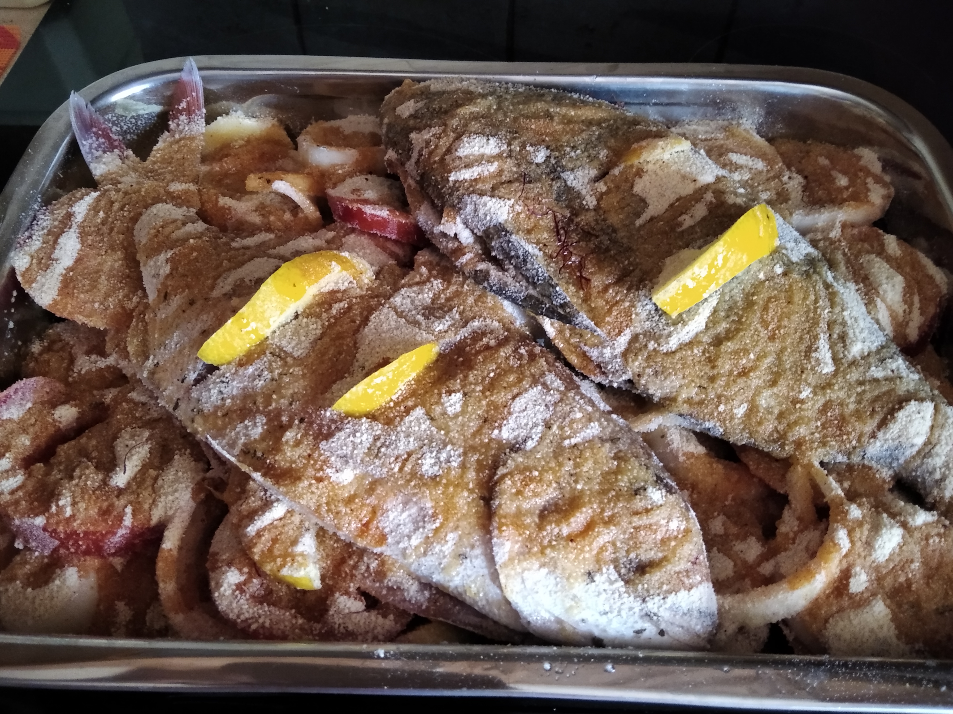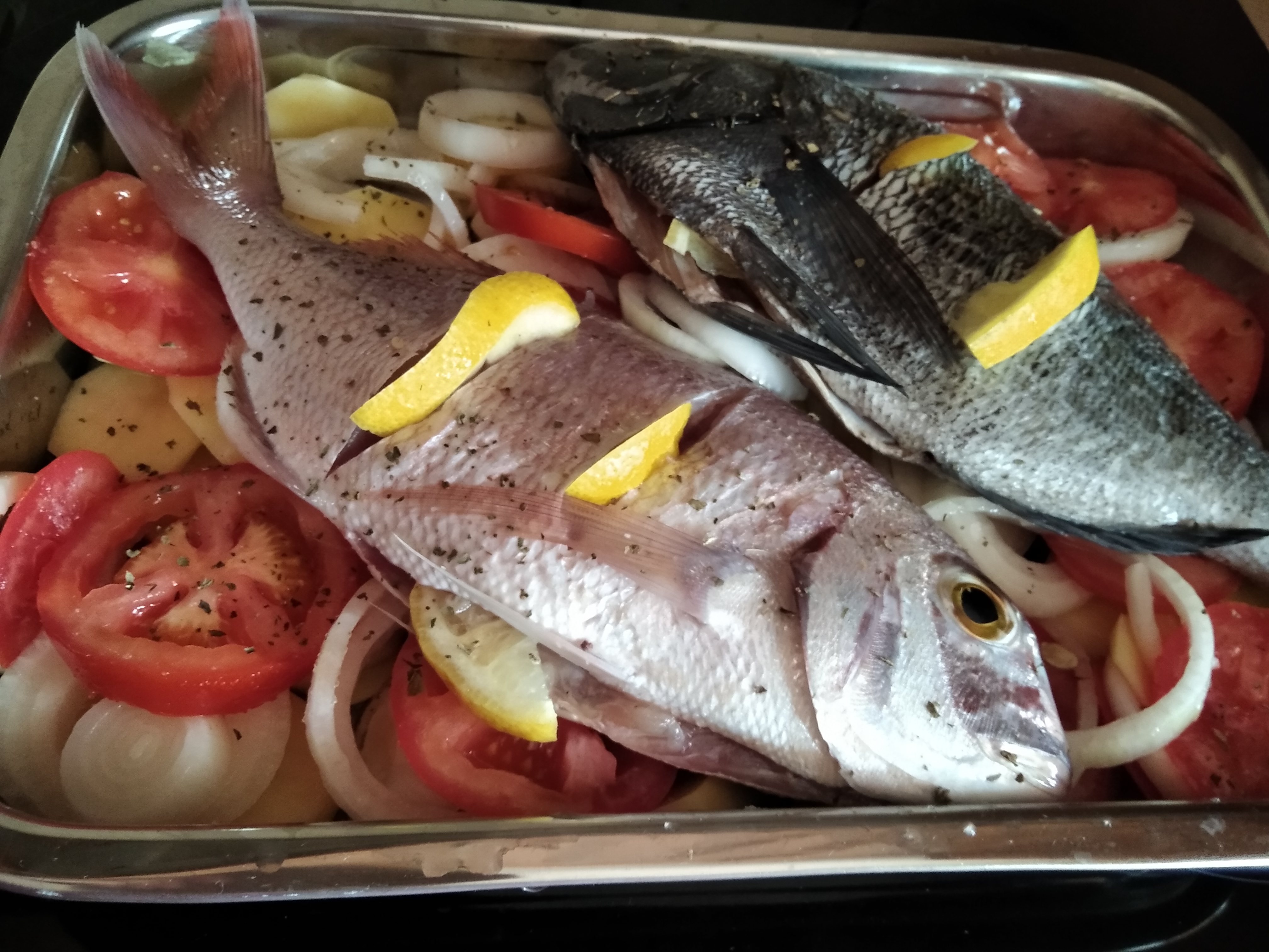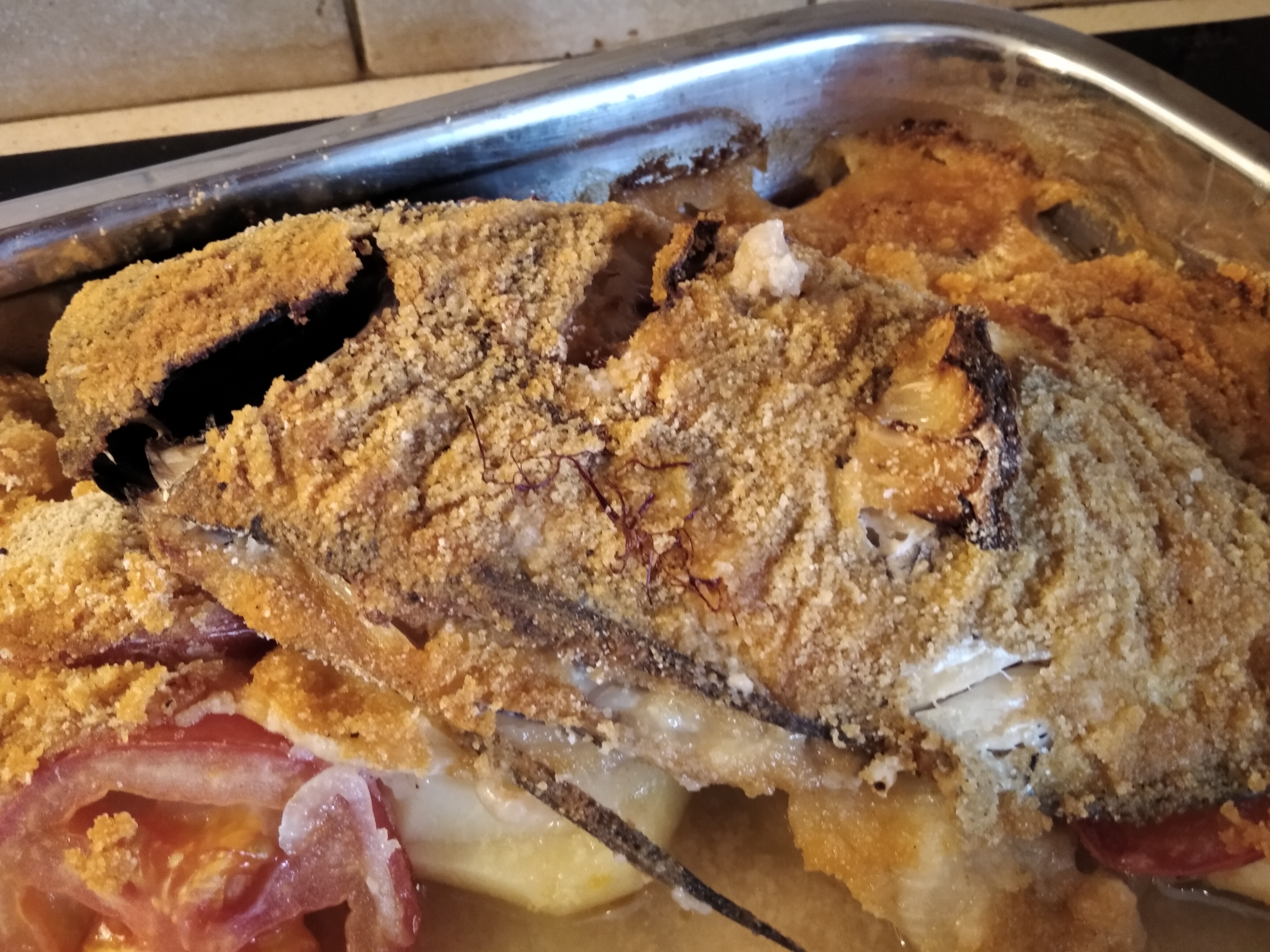 Comenzamos lavandonos muy bien las manos, luego preparamos esta delicatessen, para ello cogemos las verduras, las pelamos y limpiamos con agua del grifo en el colador mediano de cocina, luego las dejamos escurrir un poco y vamos cortando las encima de la tabla de cocina con cuidado y las vamos poniendo sobre la fuente de horno formando una capa cada vez con dichas verduras, primero cortamos las patatas en rodajas no muy gruesas(un poco solamente), formamos un capa sobre la fuente de horno, luego hacemos el mismo proceso con las cebollas, cuando las cortamos en rodajas deshacemos los aros de las cebollas y las extendemos sobre las patatas que ya tenemos en la fuente de horno y por último hacemos el mismo proceso con los tomates, los extendemos también sobre las cebollas luego les ponemos sal con cuidado para que se mantengan las capas que hemos formado anteriormente, luego cogemos el pescado que ya lo tenemos limpio, podemos limpiarlo con agua del grifo o con agua de mar con la cual queda más sabroso y también el pescado podemos comprarlo o pescarlo, de una manera o de otra queda igual de bueno, pues una vez que lo tenemos listo, lo ponemos en la fuente encima de las capas de verduras , pero antes le hemos hecho unos cortes, luego lo salamos y le ponemos unas rodajas de limon sobre los cortes, le ponemos los ajos enteros distribuidos en la fuente de horno , y le ponemos sobre todos los ingredientes un poco de albahaca , luego cogemos la fiambrera pequeña, le ponemos dentro pan rallado, pimentón dulce, hebras de azabran , le ponemos la tapadera y renovemos para mezclar bien los ingredientes, luego extendemos esta mezcla por toda la fuente, que quede bien cubierto, luego aove por todo, para que este bien bañadito y por último le añadimos una taza y media de agua potable, y listo para introducirlo en el horno a ciento ochenta grados con el turbo, una hora y media más o menos, y luego ya apagamos el horno ,comprobamos pinchando con un tenedor sobre todo las patatas que estén tiernas y también comprobamos que el pescado este bien hecho, así pues luego esperamos a que se enfríe un poco y listo ya para servirlo.
