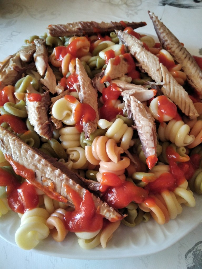 Comenzamos, lavandonos y secandonos las manos, luego preparamos la olla con la tapadera para hervir la pasta vegetal, para ello le ponemos agua del grifo con un pellizco generoso de sal y la ponemos a fuego alto con la tapadera,cuando empiece a hervir le añadimos la pasta ,bajamos un poco el fuego,a fuego medio y con una cuchara de madera o de silicona vamos removiendola para que quede suelta de vez en cuando , luego cuando está tierna la pasta, apartamos la olla del fuego, lo apagamos y escurrimos la pasta que la habremos puesto dentro del colador grande pasandola al mismo tiempo por agua del grifo luego la dejamos escurrir de nuevo y la ponemos en la fuente grande que tenemos también preparada,le añadimos sal después preparamos los filetes de Caballas, para ello abrimos la lata con un abridor con mucho cuidado de no hacernos daño luego con el tenedor vamos poniendo las Caballas sobre los tirabuzones vegetales y con la cuchara sopera extendemos el tomate Solís sobre todos los ingredientes, así ya tenemos este rico bocado a punto para ser degustado.