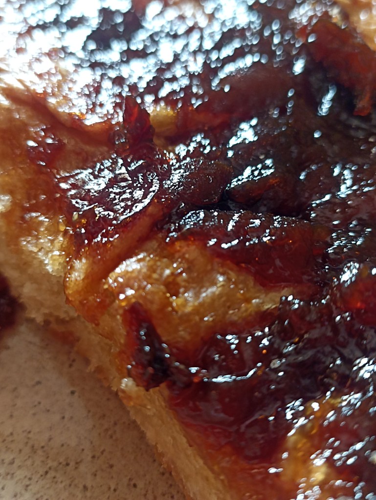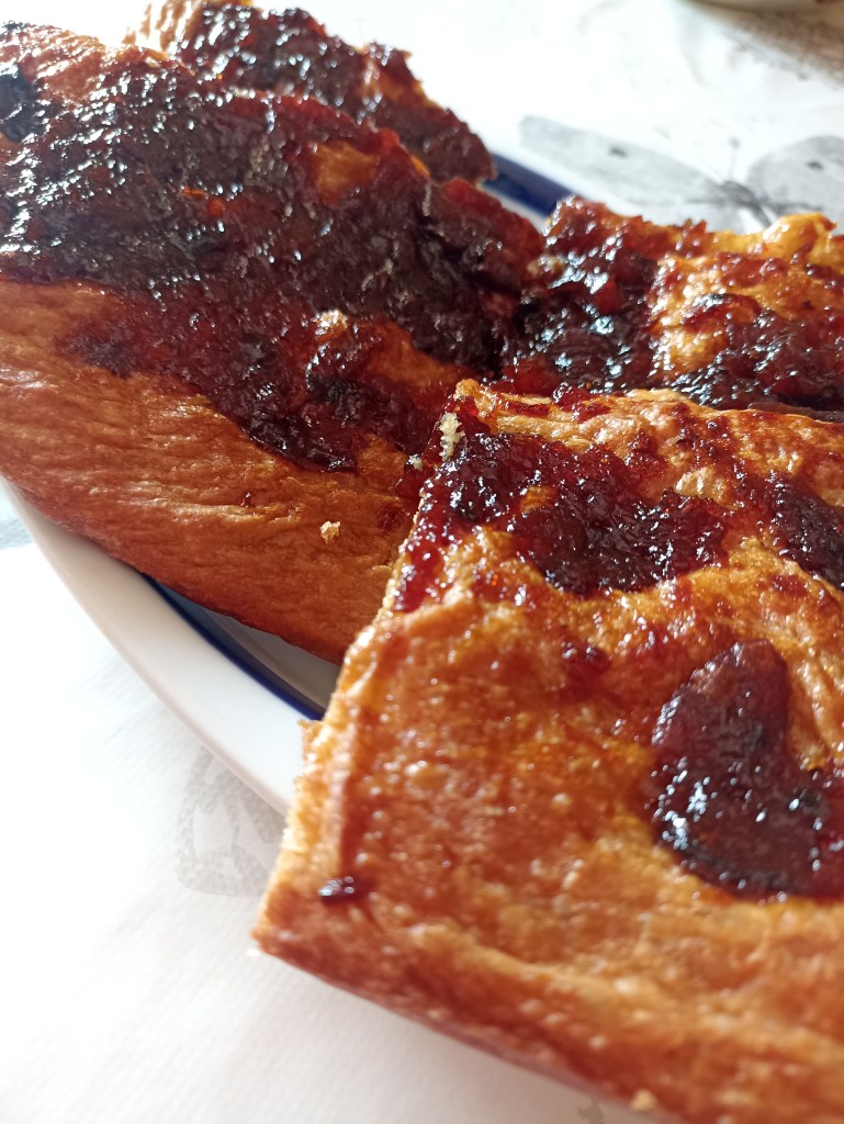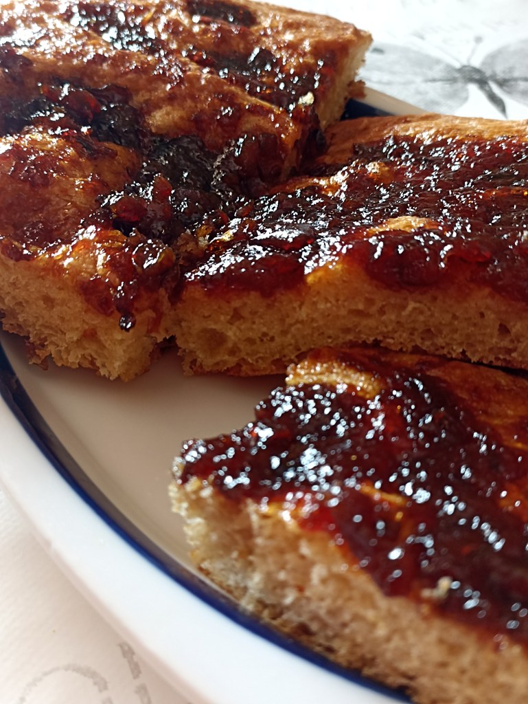 En primer lugar hervimos una patata de unos doscientos gramos ,para ello la pelamos ,la limpiamos y la troceamos para ponerla en una cacerolita con su tapadera y agua que la cubra ,(puede ser del grifo ,porque luego la tiraremos no la utilizamos ),después cuando esta cocida la patata la sacamos con una espumadera bien escurridos los trozos y los ponemos en un plato hondo,esperamos unos minutos a que se enfríen ,con un tenedor los chafamos muy bien ,que no nos queden grumos ,luego cuando estan frios los trozos de patatas añadimos un huevo entero a temperatura ambiente,mejor batido ,luego cien gramos de azúcar y volvemos a mezclar todos los ingredientes ,los bien ligamos ,después dentro del bol ponemos un sobre de levadura de panadería y harina alrededor de está haciendo un redondel luego ponemos también cien gramos de aove y por último añadimos los ingredientes que tenemos en el plato hondo y ya solo nos queda amasarlos siempre en una misma dirección y con una cuchara sopera ir añadiendo harina poco a poco y amasar ,así hasta que consigamos tener todos los ingredientes tan bien ligados que formemos una bola sin que se nos pegue la harina en las manos luego tenemos preparada la fuente de horno con el papel vegetal ,extendemos la masa encima del papel vegetal y con nuestras manos le damos forma a la masa ,redonda más Grande o más pequeña….luego la tapamos con un paño limpio de cocina y la ponemos en un lugar de esta que no tenga corriente ni frio y la dejamos tobar ,una vez que tenemos este paso hecho ,volvemos a amasarla y de nuevo la extendemos sobre el papel vegetal para que tobe (a esto le llamamos dos Tous) luego ya solo queda en este caso la mermelada de melocotones por encima bien extendida y cocerla al horno con el fuego por arriba y por abajo (no turbo )una media hora con el horno precalentado siete minutos a 180grados,el tiempo de cocción es relativo ,depende del horno que cada uno tenga ,y luego ya la sacamos del horno comprobamos con un palillo la textura y esperamos unos minutos a que se enfríe un poco y ya lista para ser degustada .