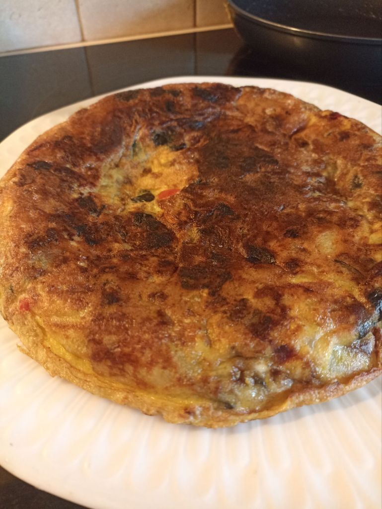 Comenzamos lavando nos muy bien las manos ,luego preparamos los ingredientes que necesitamos para elaborar este delicioso bocado ,así cogemos una berenjena Grande ,medio pimiento Grande rojo , tres o cuatro patatas medianas , luego limpiamos la berenjena,le quitamos el sombrerito y sin pelarla la cortamos en taquitos y los vamos poniendo dentro de un colador ,:luego pelamos las patatas y las cortamos a taquitos y el pimiento limpio ya lo cortamos a taquitos también, ponemos todo dentro de un colador ,los limpiamos con agua del grifo,escurrimos muy bien y apartamos,mientras preparamos la sartén con aove suficiente como para hacer la tortilla y la ponemos a fuego medio ,cuando empieza a hervir le añadimos los ingredientes que tenemos en el colador ,y los freímos removiendo los con cuidado con una cuchara de madera o de silicona . Mientras se frién los ingredientes preparamos los huevos, *los cuales comprobamos si estan aptos para utilizarlos en un recipiente hondo que le añadimos agua hasta arriba e introducimos el huevo uno a uno tiene que quedar sumergido ,en caso contrario que subiera hacia arriba flotando es que no es apto para utilizarlo * . Cuando hemos comprobado ya que los huevos están aptos ,en un plato Grande hondo los vamos poniendo uno a uno (pero antes de utilizarlos los hemos tenido a temperatura ambiente unos minutos ) ,y así cuando tenemos todo este proceso listo y todos los huevos dentro del plato hondo,le añadimos un pellizco generoso de sal y una puntita de levadura química y un toque de cúrcuma y los batimos con cuidado ,luego apartamos y sacamos de la sartén con la espumadera los ingredientes de la sartén los ponemos en un plato plano y luego apartamos el aove de la sartén en un recipiente metálico el cual es apropósito para estos casos con el aceite tan caliente ; luego ya con la sartén limpia de aove,le ponemos los huevos batidos e inmediatamente le añadimos los alimentos que hemos frito ,los entendemos por toda la base del huevo dentro de la sartén y vamos haciendo la tortilla,moviendo la sartén con mucho cuidado evitando que se nos pegue ,luego pasados unos minutos cogemos un plato Grande plano lo ponemos encima para girarla ,así le damos la vuelta y volvemos hacer la tortilla,esperamos unos minutos ; así le damos las vueltas que queramos para que tenga la textura que más nos guste la tortilla ,luego ya apagamos el fuego y volteamos la tortilla en un plato plano limpio y lista ya ,solo nos quedará preparar los pinchos . Para ello preparamos los espárragos,los cuales los escurrimos y los cortamos en trozos moderadamente,luego hacemos lo mismo con el queso curado ,el cual cortamos un trozo le quitamos la piel y troceamos y luego con palillos pinchamos un trozo de queso ,un trozo de espárragos y la tortilla la tenemos troceada en un plato aparte ,así pinchamos el palillo con nuestro trozo de espárragos y queso y un trozo de tortilla ,así vamos haciendo trozo a trozos y decoramos con unos espárragos enteros ,Mmmm ,deliciosos .
